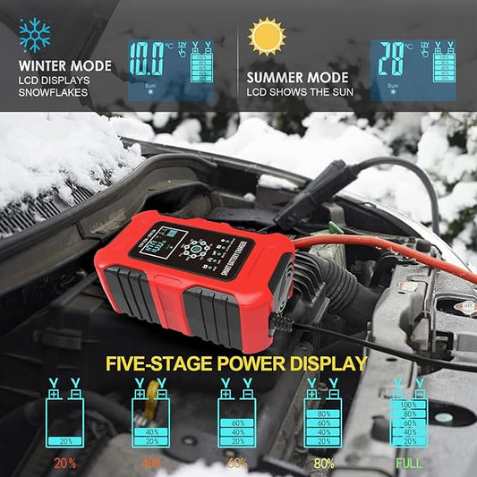 Battery Trickle Charger 12V 24V,10-Amp Multifunctional Battery Charger WetGELSLALiFePO4Lead-AcidAGM Batteries,7-Stage Quick Charger Truck Motorcycle Car ATV Lawn mower RV Tractor, Red
