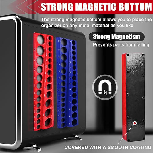 Magnetic Socket Organizer 2-Piece Magnetic Socket Holder 38 Inch Drive Metric SAE Trays Tool Storage Set Magnet Rail Holds 56 Sockets for Tool Box Drawer