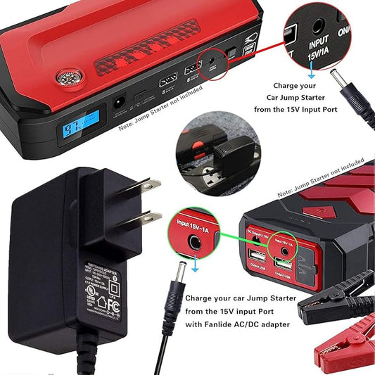 DC 15V 1A Adapter Charger for Car Jump Starter, Peak 450A 500A 600A 800A 1000A Auto Battery Booster Jump Starter Charger