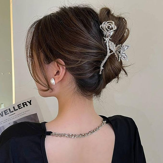Elegant Rose Metal Non-Slip Hair Claw Clips for Thin and Thick Hair - Fashionable Flower Hair Accessories for Women and Girls (Silver Rose)