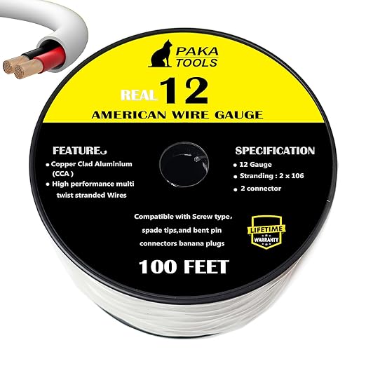 PAKA TOOLS Speaker Wire (100 Feet) (Copper Clad Aluminum) - Fire Safety in Wall Rated Audio Speaker Wire Cable CL2 Rated 2 Conductors - CCA, 100ft,ONE Spool (12 Gaige)