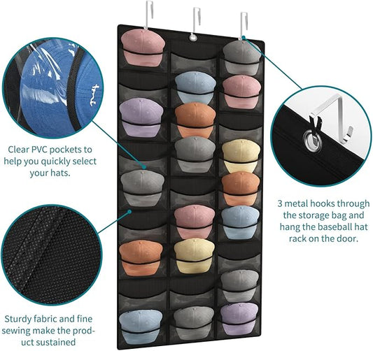 Fixwal Baseball Hat Rack, 27 Pocket Over The Door Cap Organizer Cap Hat Holder Hanger For Closet With Large Clear Pockets 3 Hooks, Hat Storage to Protect and Display, Black