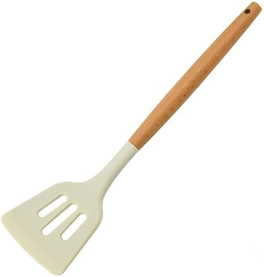 Chinese style wooden handle silicone spatula cooking pot spatula non stick pot household kitchen good item set white silicone kitchen utensils pot spoon (Leaky shovel)