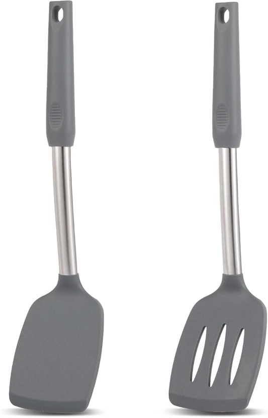 Pack of 2 Non Stick Solid & Slotted Silicone Spatula Set, Heat Resistant Silicone Turners for Fish,Eggs,Pancakes (Black Grey)