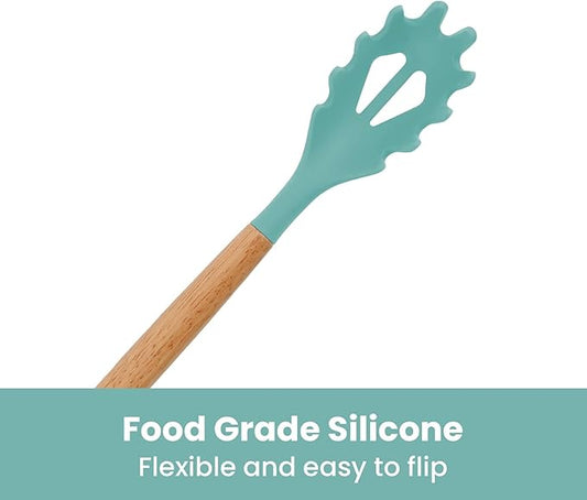 Silicone Spaghetti Spoon, Pasta Fork, 12.6 Inch Noodle Spoon, Pasta Spoon with Wooden Handle, Spaghetti Server for Cooking, BPA Free, Green