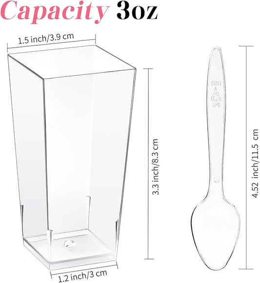 Kucoele 50 Pack 3oz Mini Dessert Cups with Spoons, Square Tall Shooter Cups Clear Plastic Party Serving Cups for Parfait, Appetizer, Pudding, Yogurt and Ice Cream