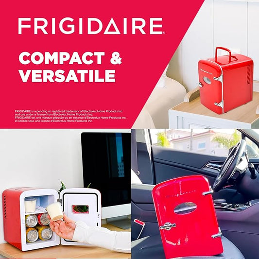 Frigidaire EFMIS129-RED_CP4 Mini Personal Fridge Cooler, 1 Gal Capacity fits Six Cans, Includes Plugs for Home Outlet & DC Charger-9.84" D x 7.09" W x 10.35" H, standard