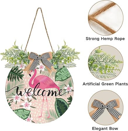xigua Tropical Pink Flamingo Welcome Sign Front Door Decor, Outdoor Hanging Porch Wreath Interchangeable Seasonal Icons for Farmhouse Wall Home Holida