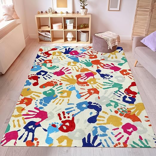 STARUIA Large Kids Rug for Playroom, 8'x10' Handprints and Footprints Colorful Rug for Classroom, Non-Slip Washable Rug for Nursery, Soft Throw Carpet Indoor Playmat for Kids Room Dorm Bedroom