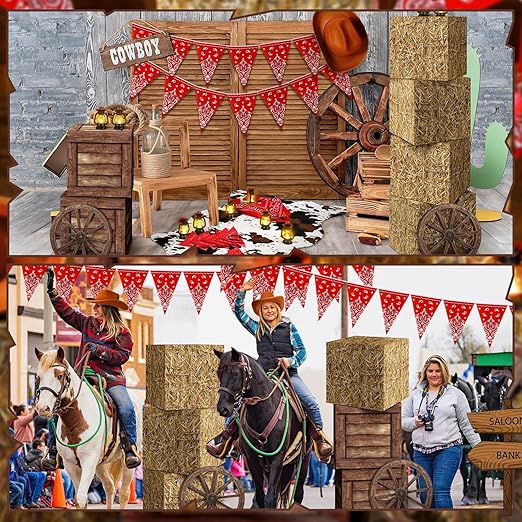 ROCEEI 40 Pcs Cowboy Theme Party Decoration Western Party Decor Rodeo Table Centerpieces Mini Cowboy Hats Lantern Carton Horseshoe Wheel Red Pull Flag Scarf Decorative for Adults Cowgirl Farm Party
