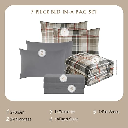 MaiReve Queen Comforter Set, Plaid Design Comforter Set 7 Pieces, All Season Comfortable Bedding Sets Queen, Lightweight, Warm and Breathable (Khaki, Queen, 90"x90")