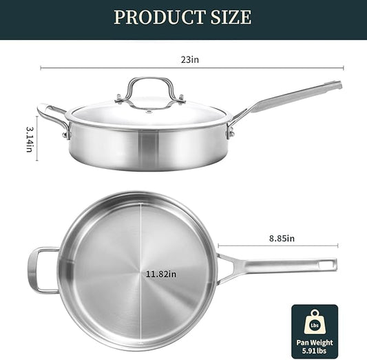 Tri-Ply Stainless Steel Saute Pan 6QT, 12 Inch Deep Frying Pan with Lids, 3-layer Saute Pan with Lid Large Skillet with Stay Cool Handle, Induction Pan, Dishwasher and Oven-Safe