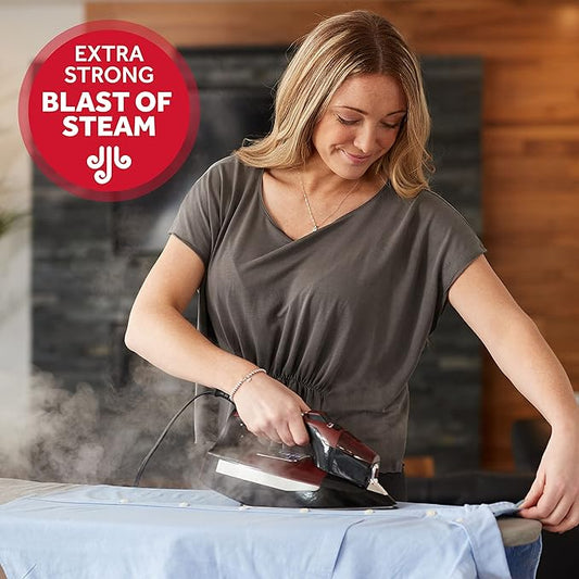 Sunbeam Professional Steam Iron, 1700 Watt, Large Nonstick Ceramic Soleplate, Horizontal or Vertical Shot of Steam, Self Cleaning, Large LED Screen and Bright LED Lights, 8' Swivel Cord, BlackRed