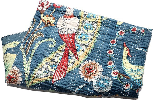 Somukara Indian Hand Block Animal Print Kantha Quilt Handmade Cotton Queen Size Kantha Bedding Throw Kantha Bohemian Blanket Bed Cover Kantha Bedspread Gudari (Blue)
