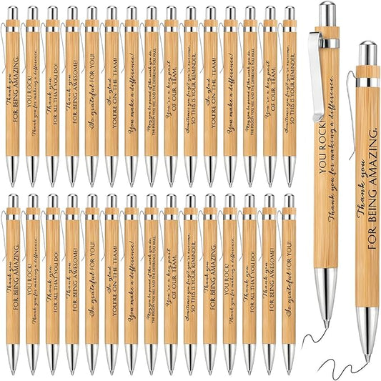 Fuutreo 30 Pcs Inspirational Bamboo Pens Thank You Wood Ballpoint Pens Graduation Employee Appreciation Gift Motivational for Office Volunteer Teacher Nurse Coworker School Black Ink, 10 Styles