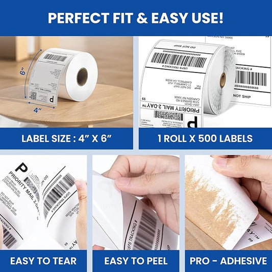 1 Pack of 500, 4x6 Thermal Direct Shipping White Label Roll for Mailing Perforated,Strong Adhesive, Commercial Grade Compatible with Printer Like Rollo, MUNBYN, Zebra, Polono,iDRPT