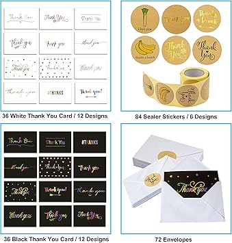 Youngever 72 Thank You Card, Envelope with Sealer Stickers Assortment, Flat Notes Greeting Cards, Blank Card, 12 Designs, 4 x 6 Inches