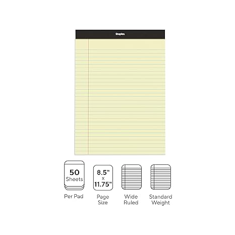 Staples Notepads, 8.5 x 11.75 Inch, Wide Ruled Legal Pads, Writing Pad for Home, Office, School, 12-Pack, Yellow Paper
