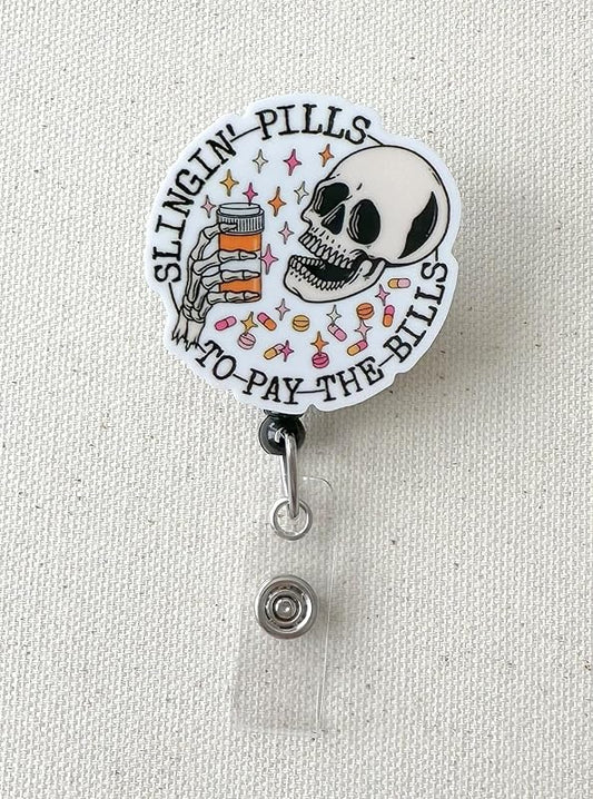 Slingin' Pills to Pay the Bills, Acrylic, Pharmacy Badge, Pharmacist, Nurse, Retractable Badge Reel With Swivel Clip and Extra-Long 34 inch cord - Badge Holder