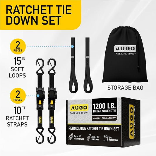 AUGO Retractable Ratchet Straps 2 Heavy Duty Ratchet Straps Self Retractable Tie Down Straps with Soft Loops Storage Bag for Motorcycle, Truck, Trailer, Cargo Van 1200 Lb Break Strength 1a x 10aTM