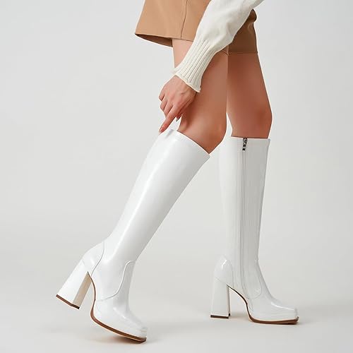 ZXHYZLZ Knee High Gogo Boots 70S For Women Wide Calf Long Tall Square Toe Chunky Boot Women