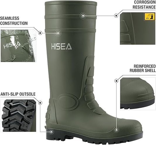 HISEA Men's Rain Boots with Steel Shank, Waterproof Rubber Protective Footwear, Seamless PVC Rainboots Outdoor Work Boots, Durable Garden Fishing Tall Kneed Boot for Agriculture and Industrial Working