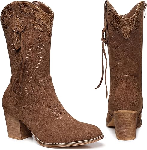SHIBEVER Cowboy Cowgirl Boots for Women: Western Country High Heel Boots Suede Zipper Mid Calf Booties