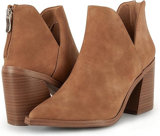 Kathemoi Womens Slip on Ankle Boots V Cutout Pointed Toe Chunky Stacked Mid Heel Booties