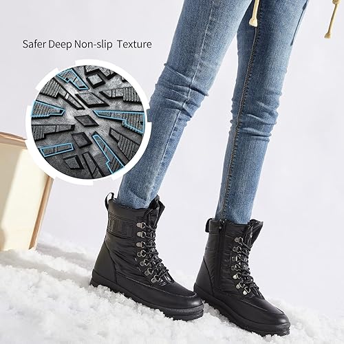 Moudki Womens Warm Fur Lined Snow Boots for Cold Weather, Non-slip Black Combat Boots with Zipper for Hiking, Lace up White Winter Booties for Women, Water Resistant Mid Calf Shoes