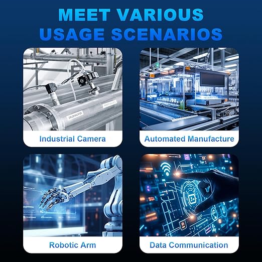 Versatile for industrial applications; This M12 to RJ45 cable is designed to meet diverse industrial needs and provide reliable connectivity in a variety of environments; Suitable for a wide range of industrial Ethernet applications, this cable works with industrial cameras, automation equipment, sensors and industrial robots and more; Making it a versatile choice for electronic processing, machine building, logistics, packaging and other industrial automation systems