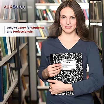 Composition notebook wide ruled is ready for any assignment. Great for school and journaling. Book has 9-34 x 7-14-inch-wide ruled white sheets, black marble cover. The cover provides an area to record your name, class, and subject.