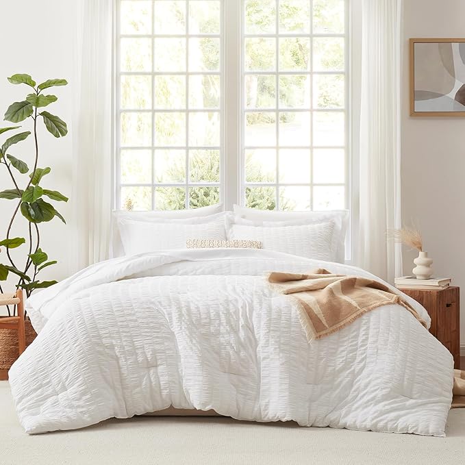 CozyLux King Comforter Set with Sheets White Seersucker Bed in a Bag 7-Pieces All Season Bedding Sets with Comforter, Pillow Sham, Flat Sheet, Fitted Sheet, Pillowcase