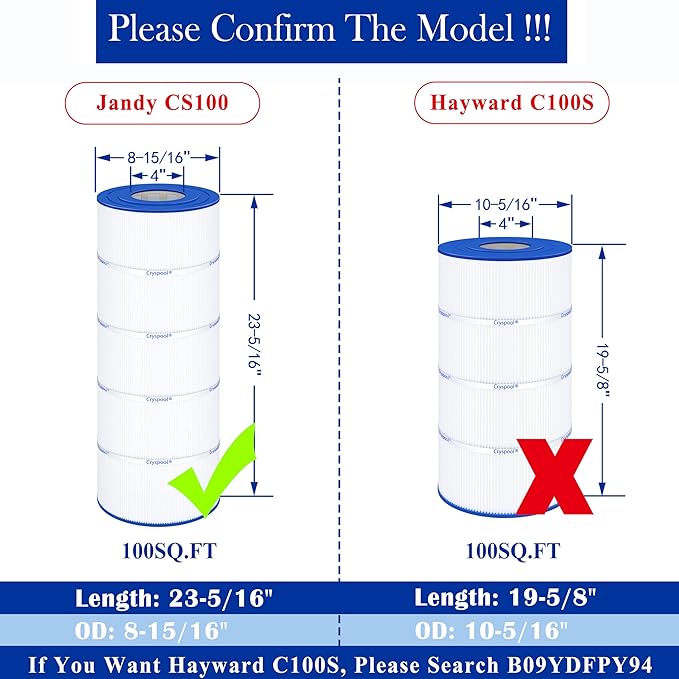 Cryspool® 08053 Filter Compatible with Jandy CS100, R0462200, PJANCS100, C-8410, FC-0821, 100 Sq. Ft Pool Filter Cartridge, 1 Pack