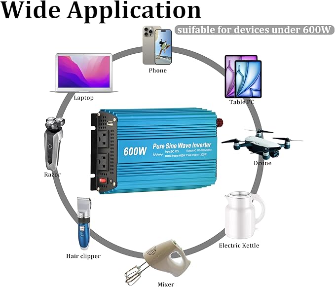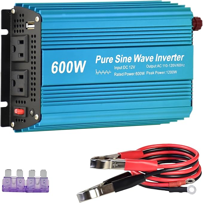 DC 12V to AC120V Pure Sine Wave Power Inverter 600W with Dual sockets Output and DC 5V 2Amp USB Output. Ideal for Most Small Power appliances. (600W) Blue