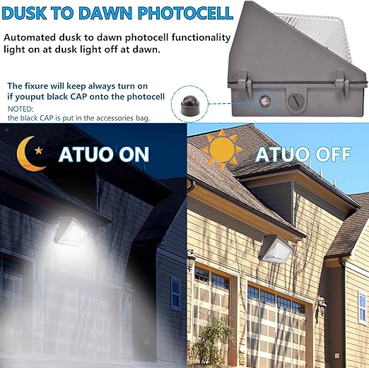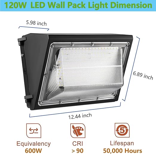 About this item 110V Dimmable 140 LUMENS PER WATT This 120W LED wall pack is epuipped with 110v dimmable fucntion which can help save your bill Aslo the 120W commercial wall pack light has a lumen count of 16800 with a beam angle of 120 degrees These outdoor wall packs are sure to provide super bright 5000K light with CRI rating of 80 Safe Reliable This 120W LED Wall Pack Light can work under the temperature range from 4 to 113 The design of the diecasting aluminum structure with a wide range of radiators makes it have excellent corrosion resistance and heat dissipation ability You dont need to worry about water leakage and rust issue 50000 HOUR LIFETIME Lifetime of more than 50000 hours and backed 120W LED Wall Pack is ideal for overnight security entrance and overhead door lighting applicationsIP65 RATED The commercialgrade housing features a lens made of highquality shatterresistant prismatic epoxy designed to withstand damaging effects of outdoor environments ETL CERTIFICATION ETL certification means our products are safer and more secure You can buy and use it without worry See more product details