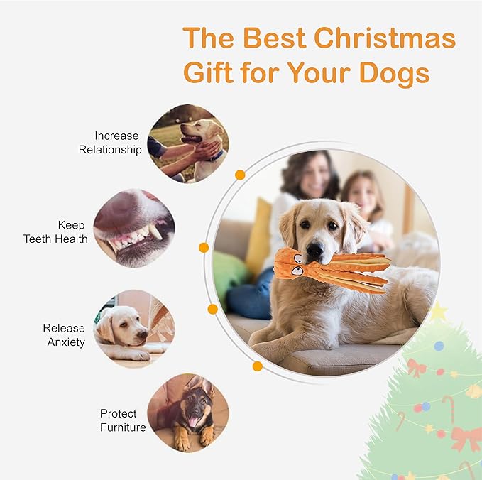 Octopus Dog Toys: This Octopus plush dog toy with bright color is an adorable character that will attract your dogs interest and keep them entertained. Your dog will have hours of fun with these cute dog toys. The size measures around 12.6 inches, perfect for puppies, small, medium and large dogs.