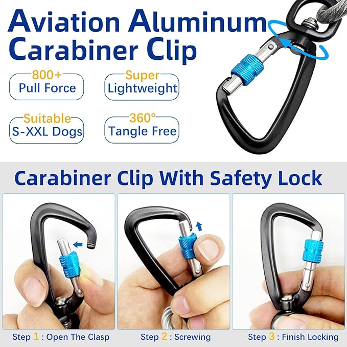 AVIATION ALUMINUM CARABINER CLIPS:The 360tangle free clips is made of top quality rust-free aviation aluminum, which is very lightweight, give dogs more ease, but also durable enough to withstand the most intense pulling . The rotation tightening technology prevent loosing off when dog running and playing