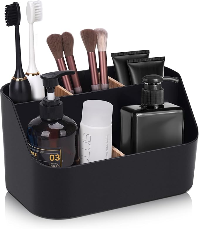 About this itemBathroom Countertop Organizer The toothbrush holders for bathrooms sizeL76W45H413sturdy plastic smooth round corner and nonslip bottoms makes it more stable on the narrow counterSave Space The tooth brushing holder has been divided into 5 areas according to the dividers which can easily to store items you need in a placelike toothbrushes toothpaste mouthwashfacial cleanser dental flosser razor shaver combMultifunctional The toothbrush and toothpaste holder can also be a makeup organizervanity organizermen bathroom organizer kitchen organizer hairbrush holderSuitable for bathroom countertopvanitykitchenofficerestroomtabledormapartmenttoiletryDetachable and easy cleaning The bathroom toothbrush holder has a nested designits space was divided into 5 compartments by 3 dividersit can be easily pulled out to allow full access to the interior cleanBathroom Decor The cute modern black bathroom organizer suitable for different bathroom and home decoration styleskeep neat and tidy