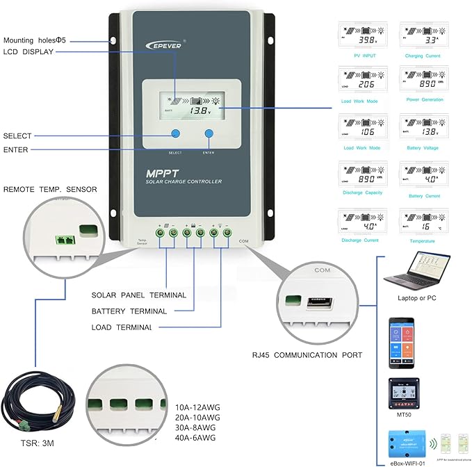 EPEVER 40amp MPPT Solar Charge Controller 12V24V Auto, Negative Grounded 40A Solar Panel Charge Regulator w LCD Display for 12V24V Gel Sealed Flooded and Lithium Battery