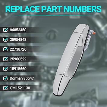 About this itemEXTERIOR CHROME DOOR HANDLE An upgrade design exterior chrome door handle fits rear right passenger side of your truck If your vehicle have a loose door handle or you have trouble shutting your door these door handle is your way outFIT THE FOLLOWING VEHICLE Rear passenger door handle fit for 2007 2008 2009 2010 2011 2012 2013 2014 Chevrolet Cadillac GMC SUV Pickups including 20072013 Chevy Avalanche 20072013 Chevy Silverado 1500 20072014 Chevy Silverado 2500HD 3500HD 20072014 Chevy Suburban 1500 2500 20072014 Chevy Tahoe 20072013 GMC Sierra 1500 20072014 GMC Sierra 2500HD 3500HD 20072014 GMC Yukon 20072014 GMC Yukon XL1500 2500 20072014 Cadillac Escalade 20072014 Cadillac Escalade ESV EXTREPLACE PART NUMBERS Rear right chrome door handle replace GM 84053450 22738726 15029900 15150760 replace Dorman 80547 replace ABPA Partslink Number GM1521130 Commonly found on 07 08 09 10 11 12 13 14 Chevy Avalanche Silverado Suburban Tahoe GMC Sierra Yukon Cadillac EscaladeOEM DESIGN DIRECT FIT Quality materials advanced technology used meets or exceeds OEM standards Even though this is not a genuine GM or ACDelco exterior chrome door handle but it works even better and lasts longer Save yourself times and trouble by replacing these chrome door handles yourself for your truckWHAT YOULL GET 1 x Rear Passenger Chrome Door Handle 12 Months Warranty If you have any problem with our chrome door handle feel free to contact us we will sort things out together See more product details