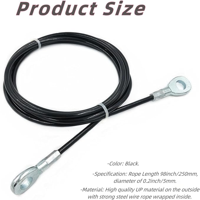 SpecificationsHeavy Duty Steel Wire Rope Length 98'',diameter of 0.2inch5mm, includes the black nylon coating.