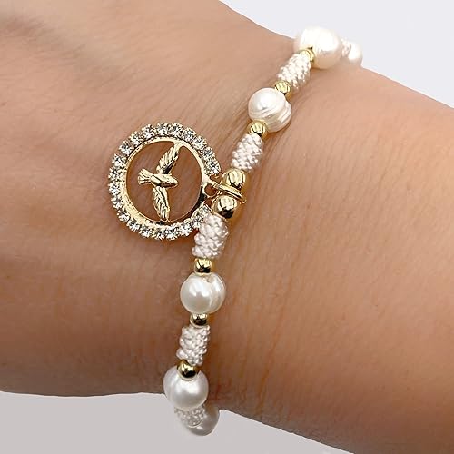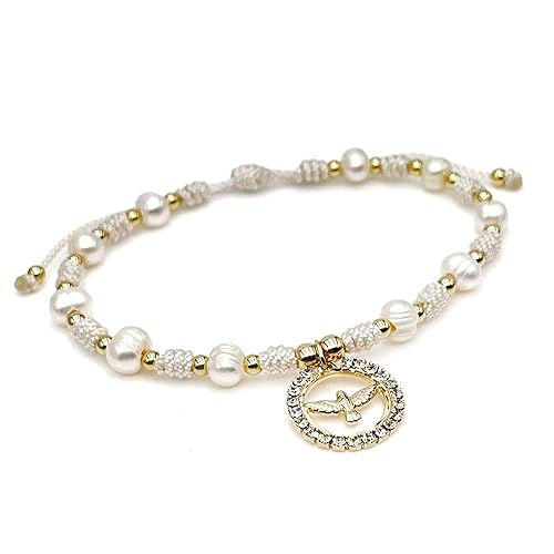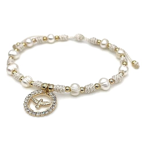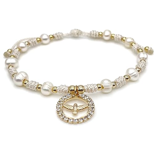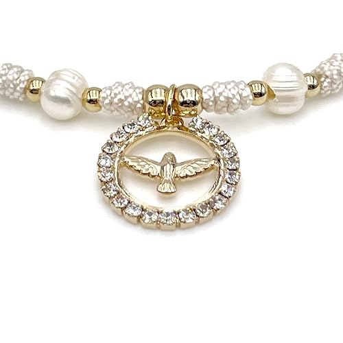 Holy Spirit 18K Gold Plated CZ Pendant on Dainty Pearls Bracelet Charm Catholic Gift Of Hope For Women and Teens