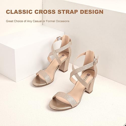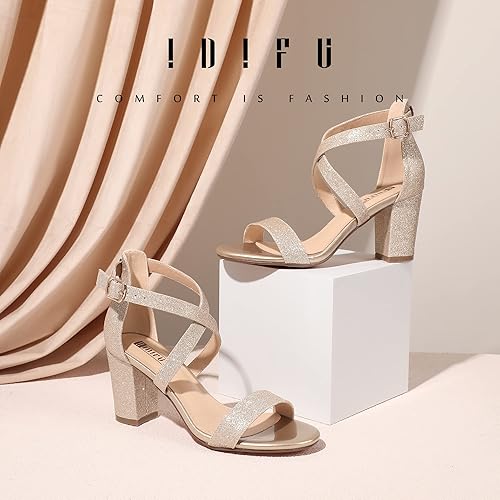 IDIFU Women's IN3 Grace Strappy Block Heels Sandals Comfy Open Toe Chunky Dress Wedding Shoes with Adjustable Cross Strap