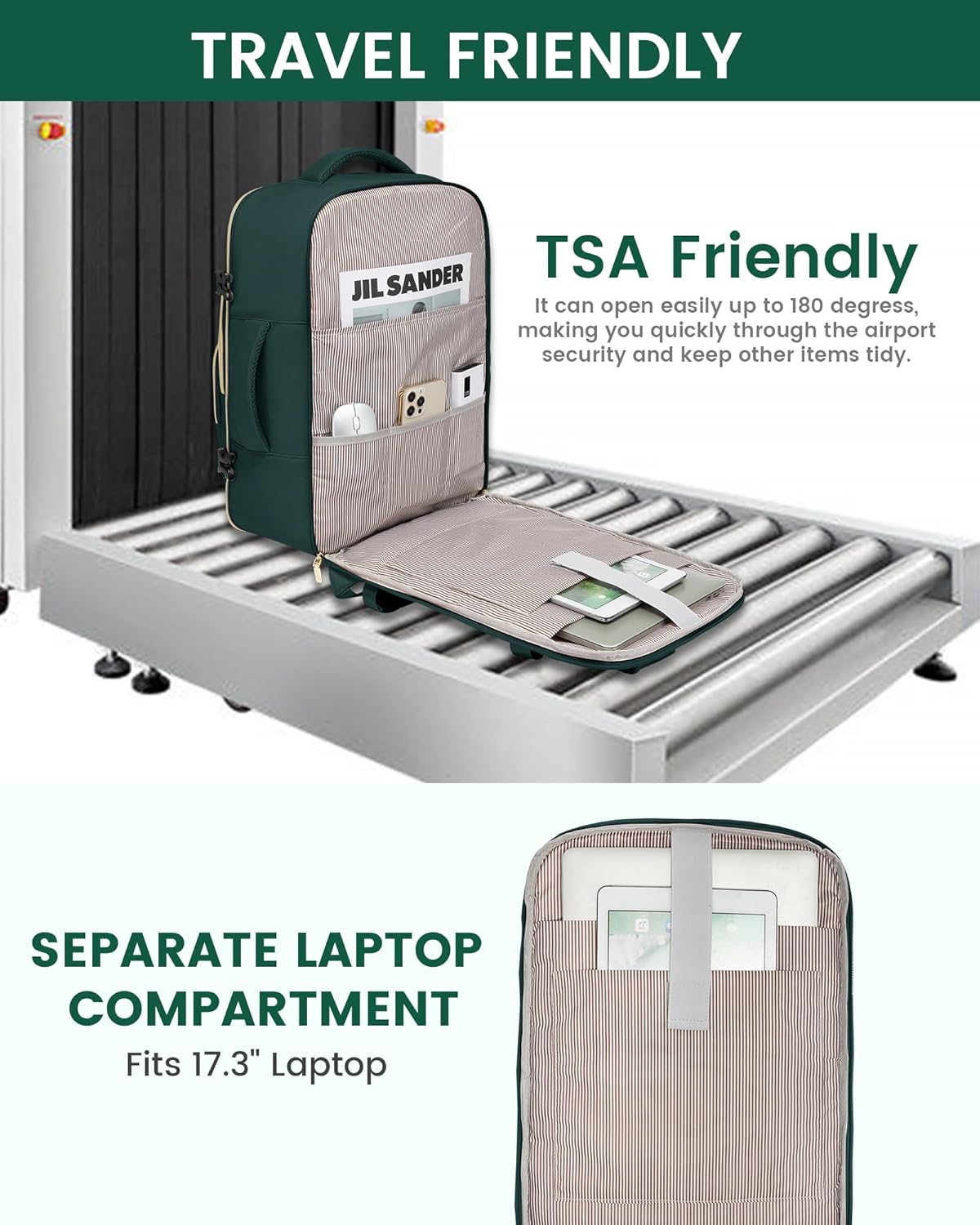 This 40L travel backpack is designed specifically for women, featuring a TSA-approved carry on bag for your convenience. The waterproof material ensures protection for your belongings, while the included 3 packing cubes help keep everything organized. With enough space to fit a 17-inch laptop, this backpack is perfect for both hiking and casual use.