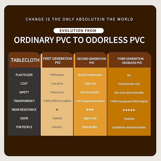 HIGH QUALITY: PVC tablecloth, environmentally friendly, non-toxic, odorless, renewable material, higher transparency than ordinary PVC tablecloths, better gloss, wear-resistant, not easy to tear, and less likely to turn yellow.