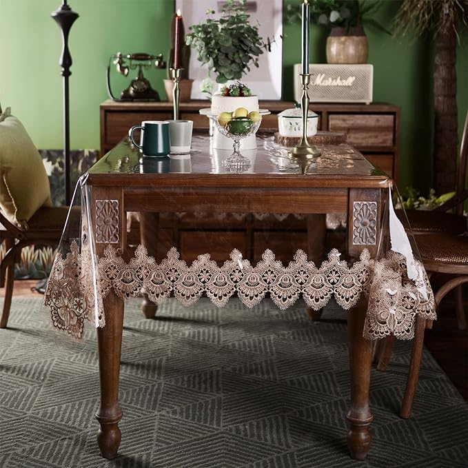 SUTAVIA Vinyl Tablecloth 100 Waterproof lace Table Cloth Environmentally PVC Oil Proof Table Protector Oblong Transparent Table Cover for Home Dining Table Parties(Gold, 60"x84")