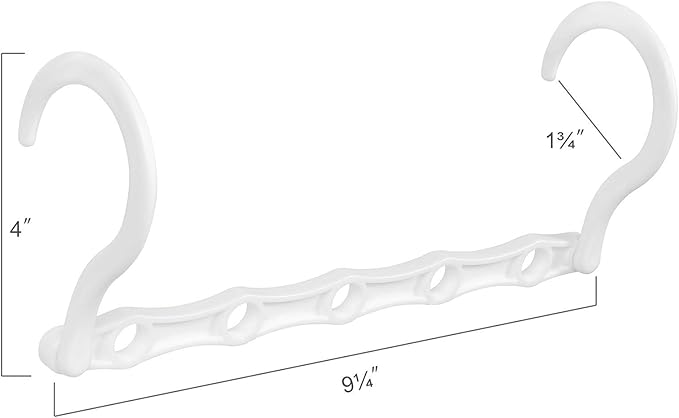 BASIC INFORMATION: this space saving hangers are made of sturdy plastic, white color and you can get 6 pcs/set; Length is 9¼ inch(not include the hooks) and height of hooks is 4 inch, hook's opening space size:1¾ inch. Each hanger can hold at least 5 clothes;