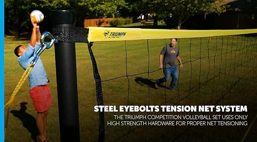 About this itemSTRONG DURABLE OUTDOOR VOLLEYBALL SET Durable 125 threepiece steel poles with gunmetal silver powdercoatingCOMPETITION LENGTH 32 standard length x 36 high net with 1 top and bottom tapeCOMPETITION VOLLEYBALL Official size and weight volleyball with inflation pump and needleGAMEPLAY ACCESSORIES INCLUDED Includes boundary lines with anchors and guylines with steel eyebolt anchorsEASY TRANSPORT WITH CARRY BAG Transport your set with the Triumph sport bag with comfortable padded shoulder strap