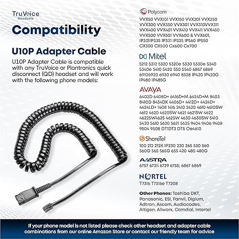 The TruVoice HD-500 wired QD headset is designed for office and call center environments, featuring a noise-canceling microphone that ensures clear communication by minimizing background noise. Its HD speakers deliver high-quality audio for improved call clarity. Compatible with a wide range of desk phones including Mitel, Nortel, Avaya, Poly, Polycom, Shoretel, Digium, ESI, and Fanvil, this headset offers reliable connectivity and professional-grade performance for demanding communication needs.
