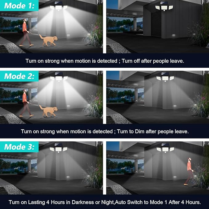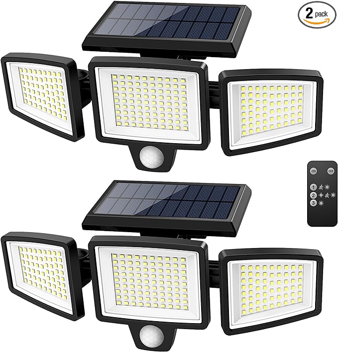Tuffenough Solar Outdoor Lights 2500LM 210 LED Security Lights with Remote Control,3 Heads Motion Sensor Lights, IP65 Waterproof,270° Wide Angle Flood Wall Lights with 3 Modes(2 Packs)